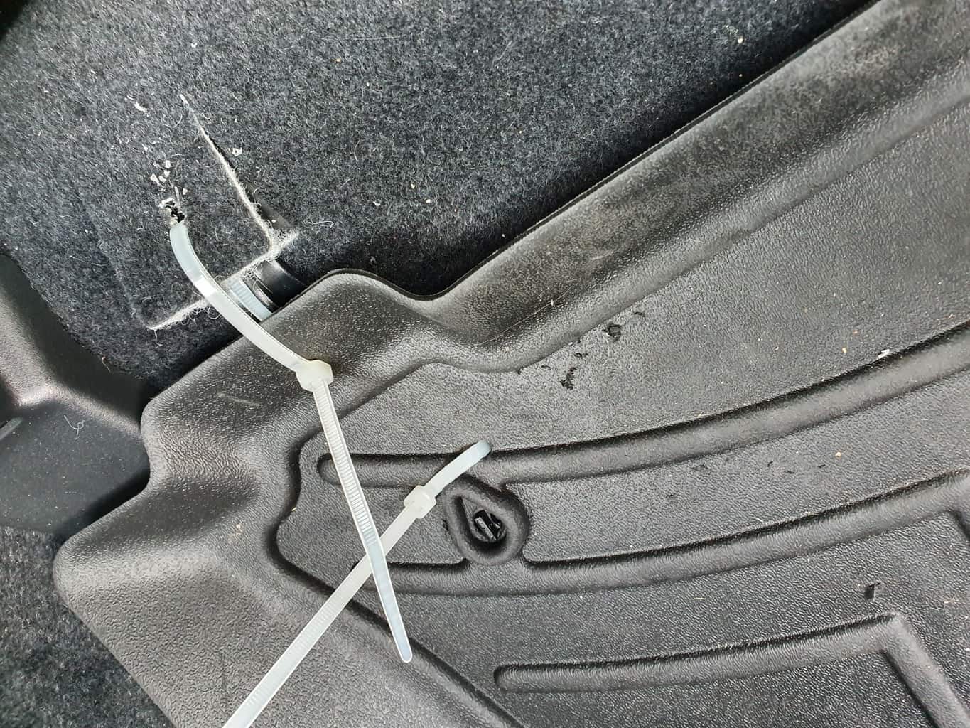 So I drilled two extra holes into the floor mats to allow a cable binder to force the Subaru mount point in place by pushing it upwards, permanently, from underneath the mat, into the hole(s).