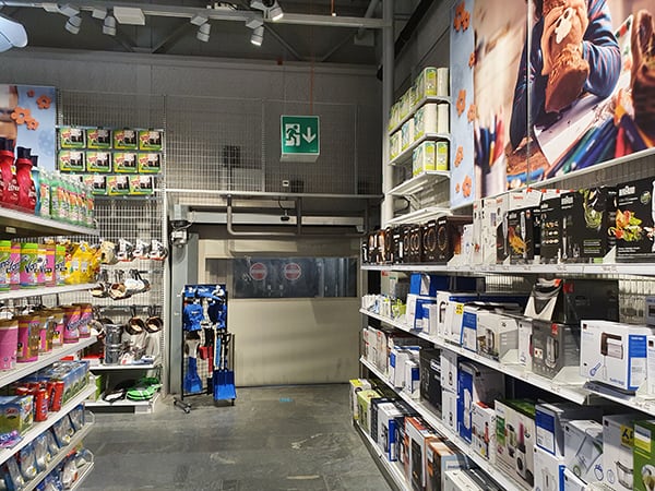 And with that broomstick, I aimed high at these shelves, where the household paper was, out of reach, or so it seemed, then I poked, and I pushed two packages of household paper from that elevated shelf, in order so they could fall down, for me to properly purchase them.