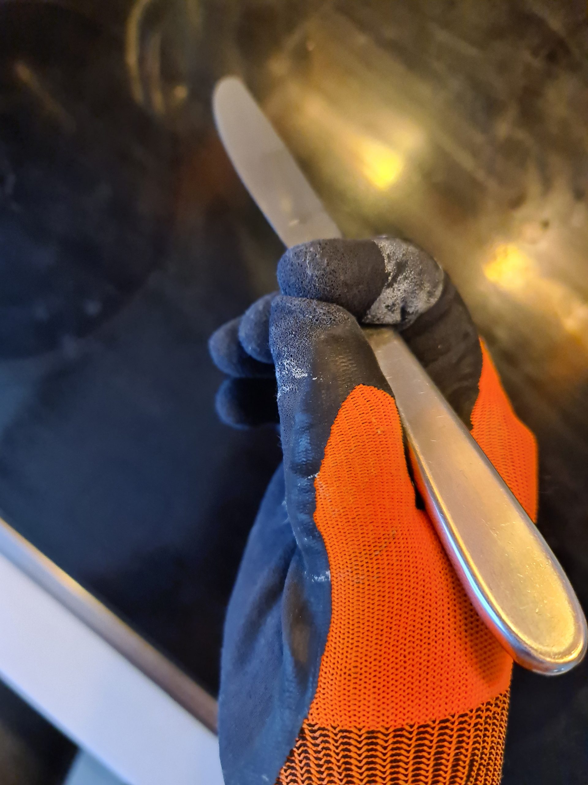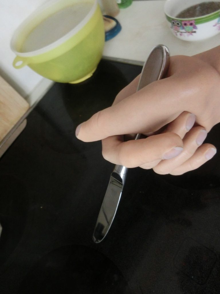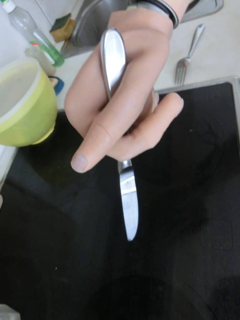 The knife also is placed between thumb/index and either index/middle (as shown here) or middle/ring finger – I do place the utensil there when the hand is more open, then I close the hand to wedge the knife into place.