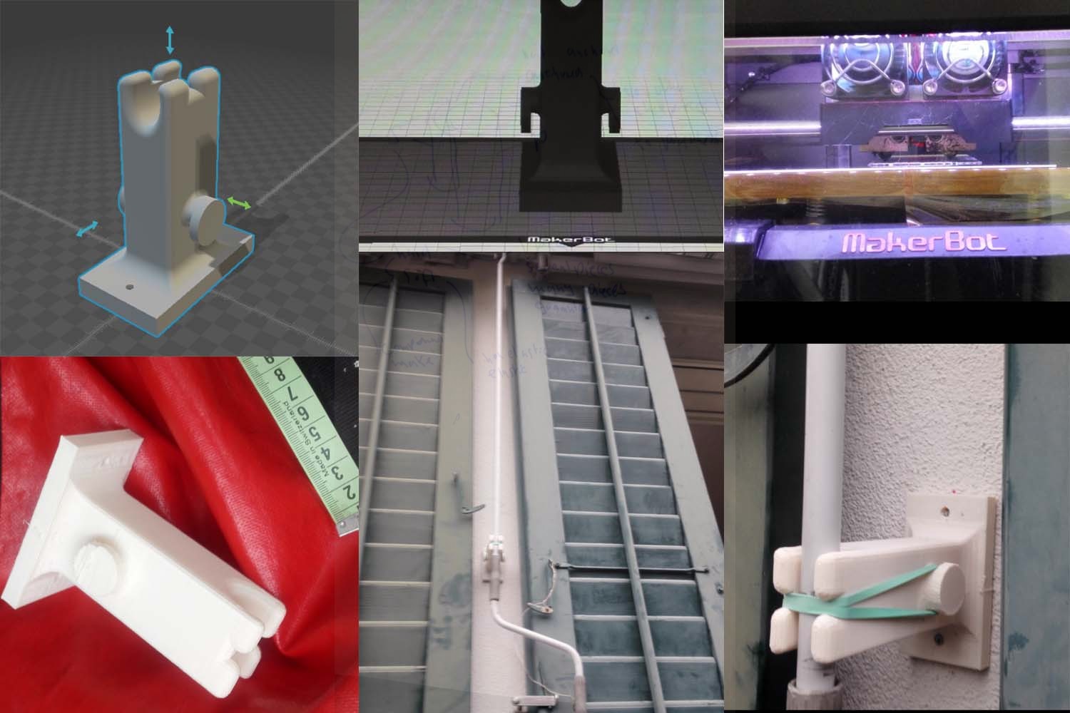 So I designed the part in 3D (top left), imported the object into the Maker Bot software (top middle), printed it using ABS (top right). The resulting object (bottom left) was mounted on the wall (bottom middle), where it now serves to hold the crank shaft of the awning in place – EXACTLY as designed.